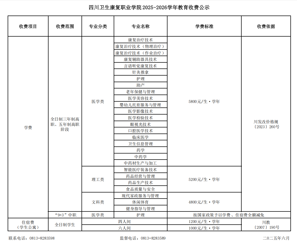 2025四川卫生康复职业学院学费有4800、5200、5800元/生·学年等不同标准;住宿费:四人间1200元/生·学年,六人间1000元/生·学年。以下为大家整理的是各专业收费标准,希望对大家有所帮助,如有变动,以学校最新公布的信息为准。