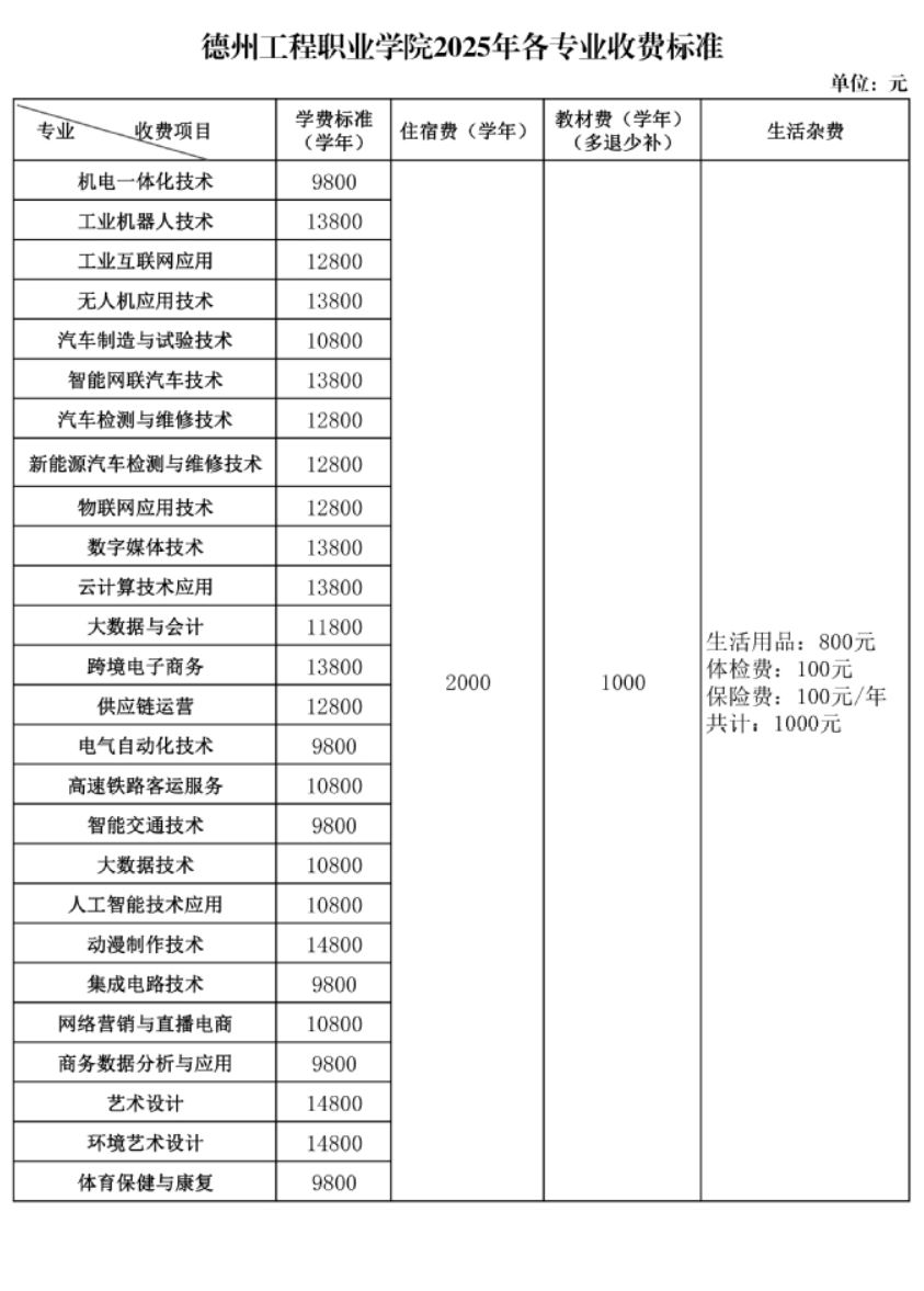 德州工程职业学院收费标准
