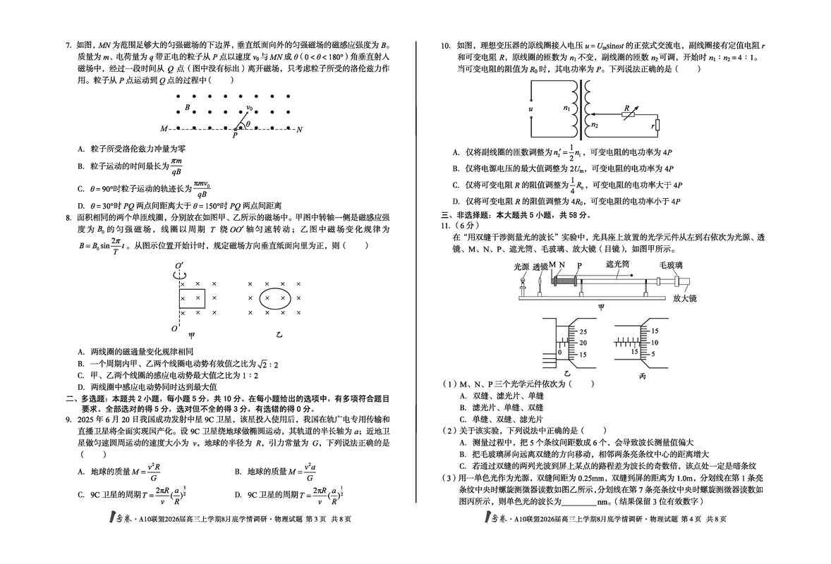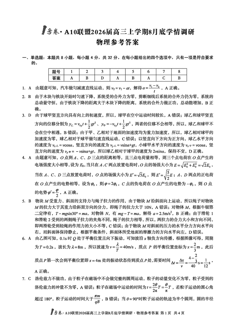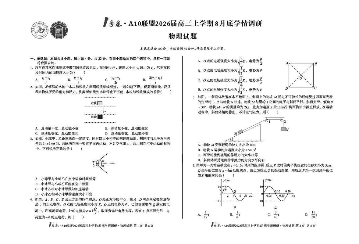 安徽省1号卷·A10联盟2026届高三上学期8月底学情调研物理考试试题质量较高,题型多样,难度适中是考察考生往期知识及考点掌握程度,为方便考生备考,考后将及时整理试题答案解析相关信息,以供考生学习交流!