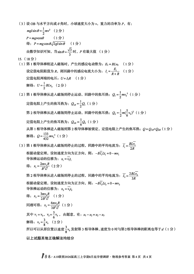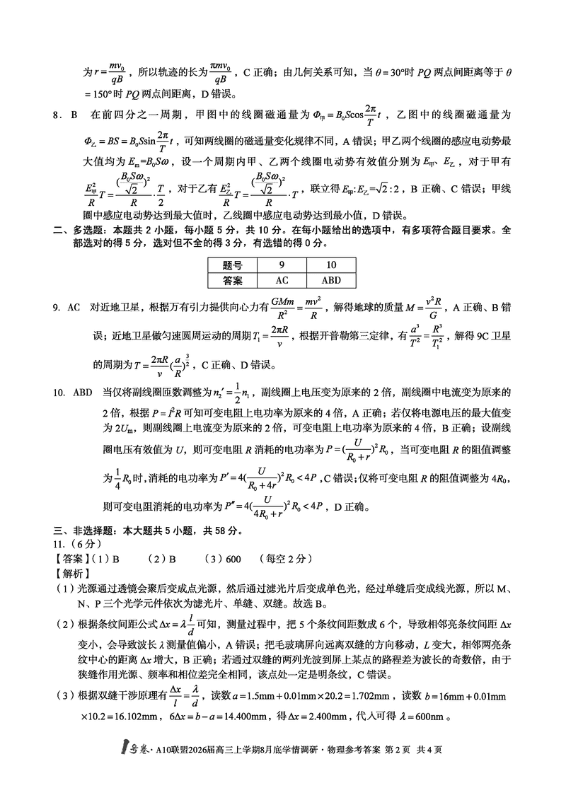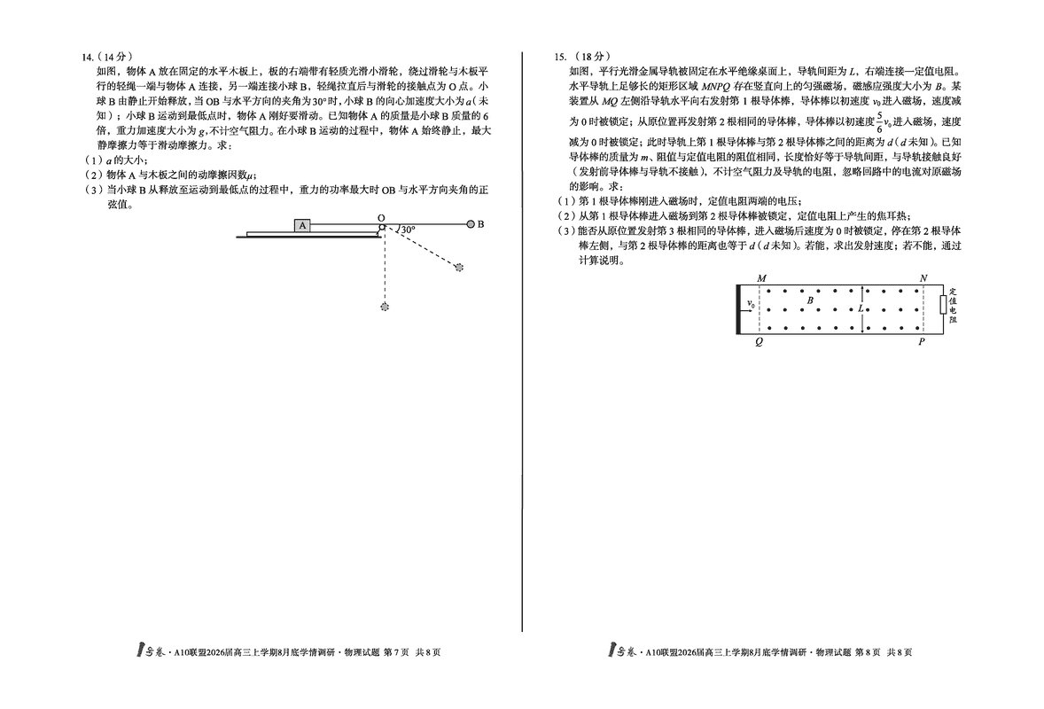安徽省1号卷·A10联盟2026届高三上学期8月底学情调研物理试卷及参考答案