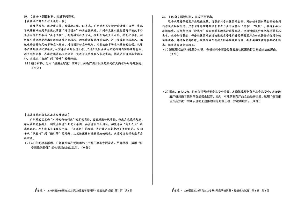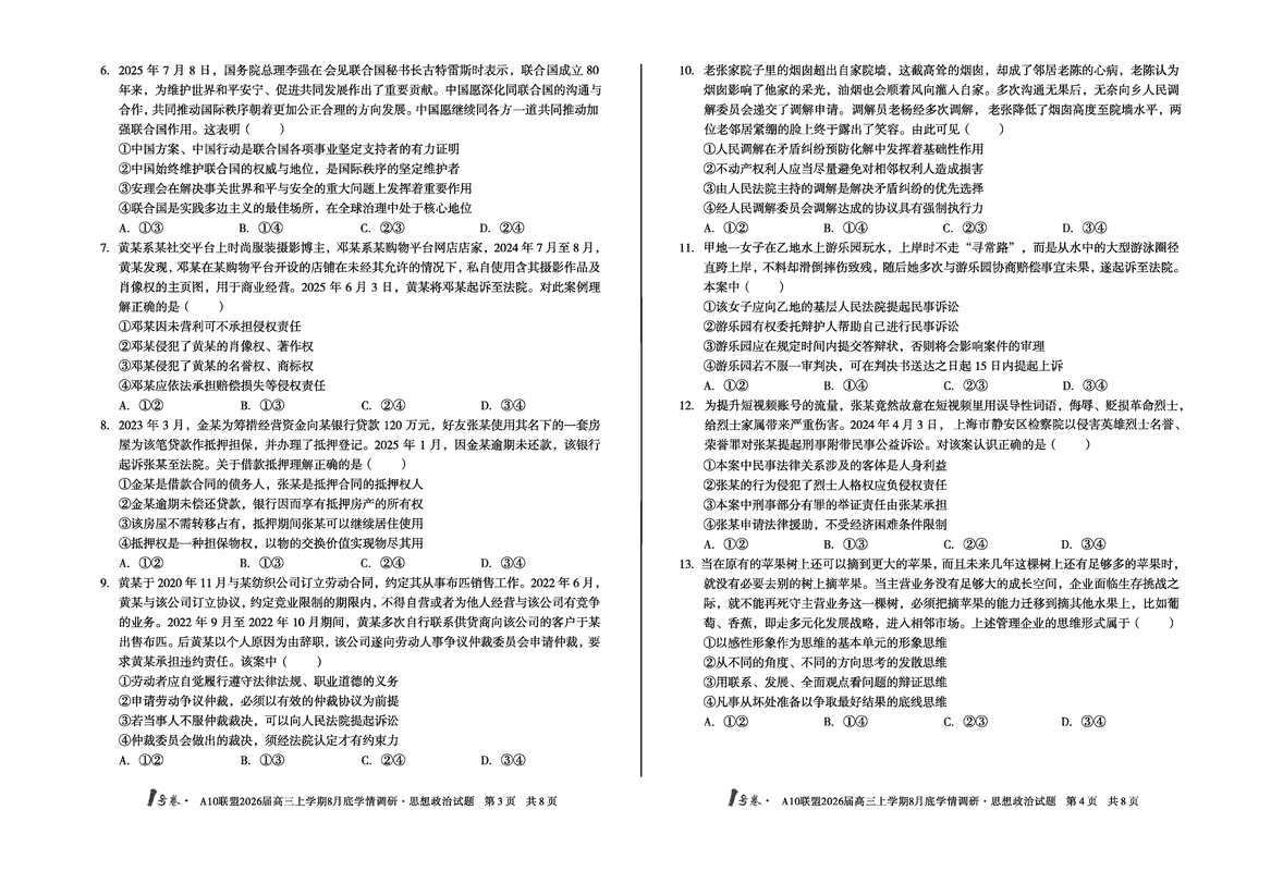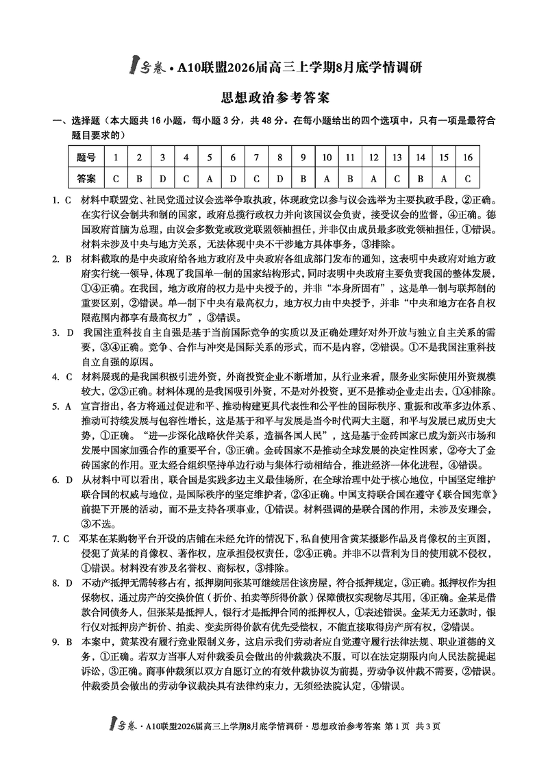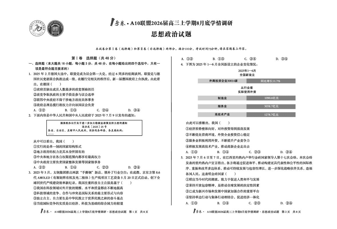 安徽省1号卷·A10联盟2026届高三上学期8月底学情调研政治考试试题质量较高,题型多样,难度适中是考察考生往期知识及考点掌握程度,为方便考生备考,考后将及时整理试题答案解析相关信息,以供考生学习交流!
