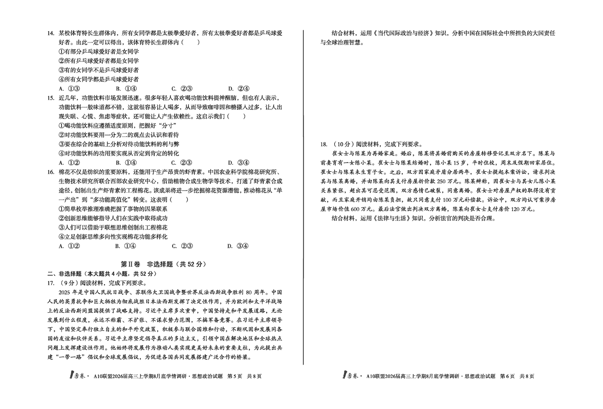 安徽省1号卷·A10联盟2026届高三上学期8月底学情调研政治试卷及参考答案