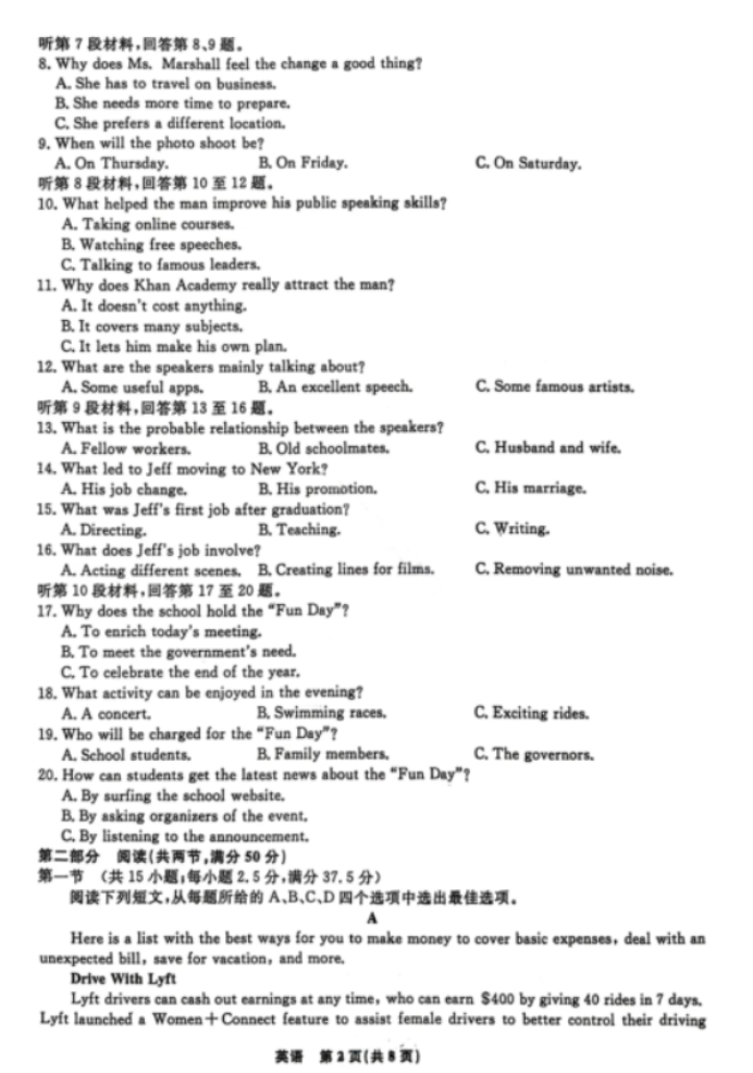 2025届八省八校T8联考高三3月联合测评英语试卷及参考答案汇总